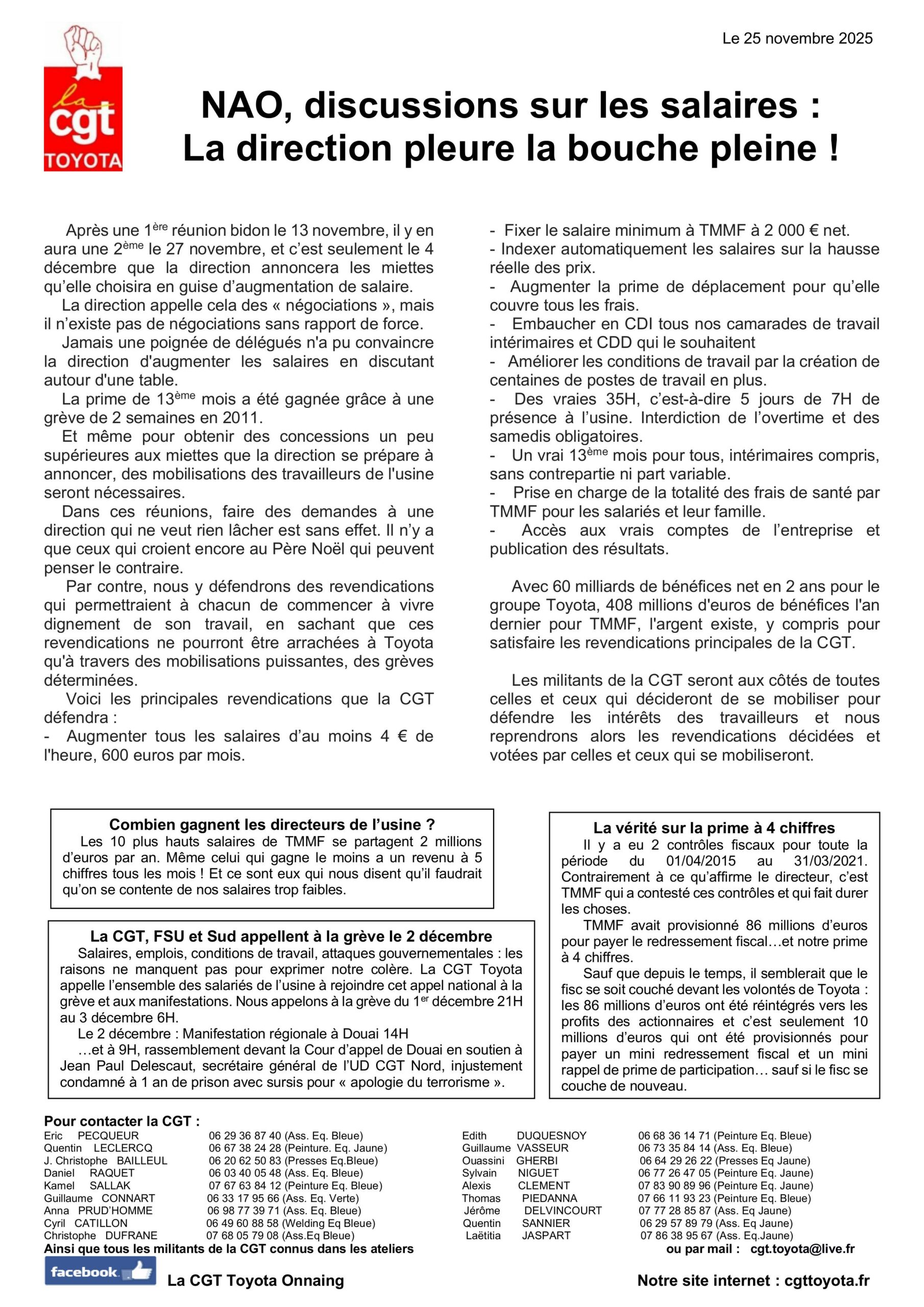 Les 10 plus hauts salaires de l’usine qui se partagent 2 millions d’euros de revenus annuels n’ont pas besoin de « gagner plus » … et ce sont eux qui nous imposent des salaires insuffisants, du sous-effectif permanent et des cadences usantes… au plus grand profit des actionnaires de Toyota.